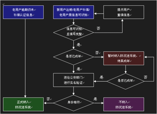 实名信息显示为已满18周岁的用户,将被初步判定为成年人。其实名信息在等待公安部门验证前将被处于非防沉迷状态,如果通过公安部门的实名验证,则正式进入非防沉迷状态。如失败,则被纳入防沉迷状态。在注册后任何时间用户都可自行至实名认证提交实名信息至公安机关进行验证。